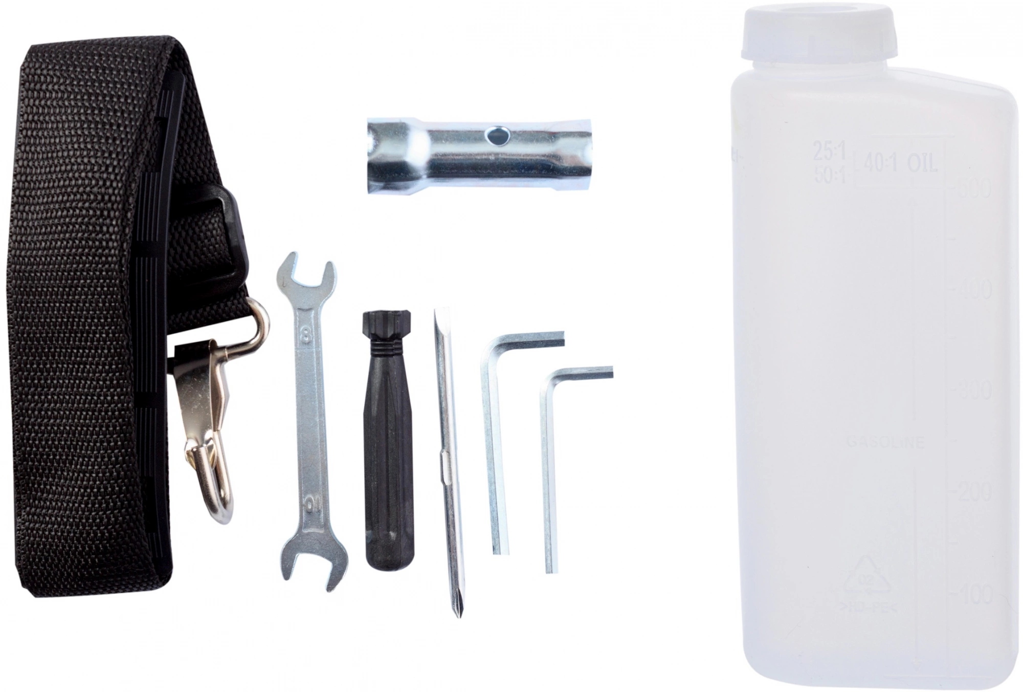 Триммер бензиновый, Ручка, Штанга, Режущий диск, катушка с леской, Защитный щиток, Наплечный ремень.