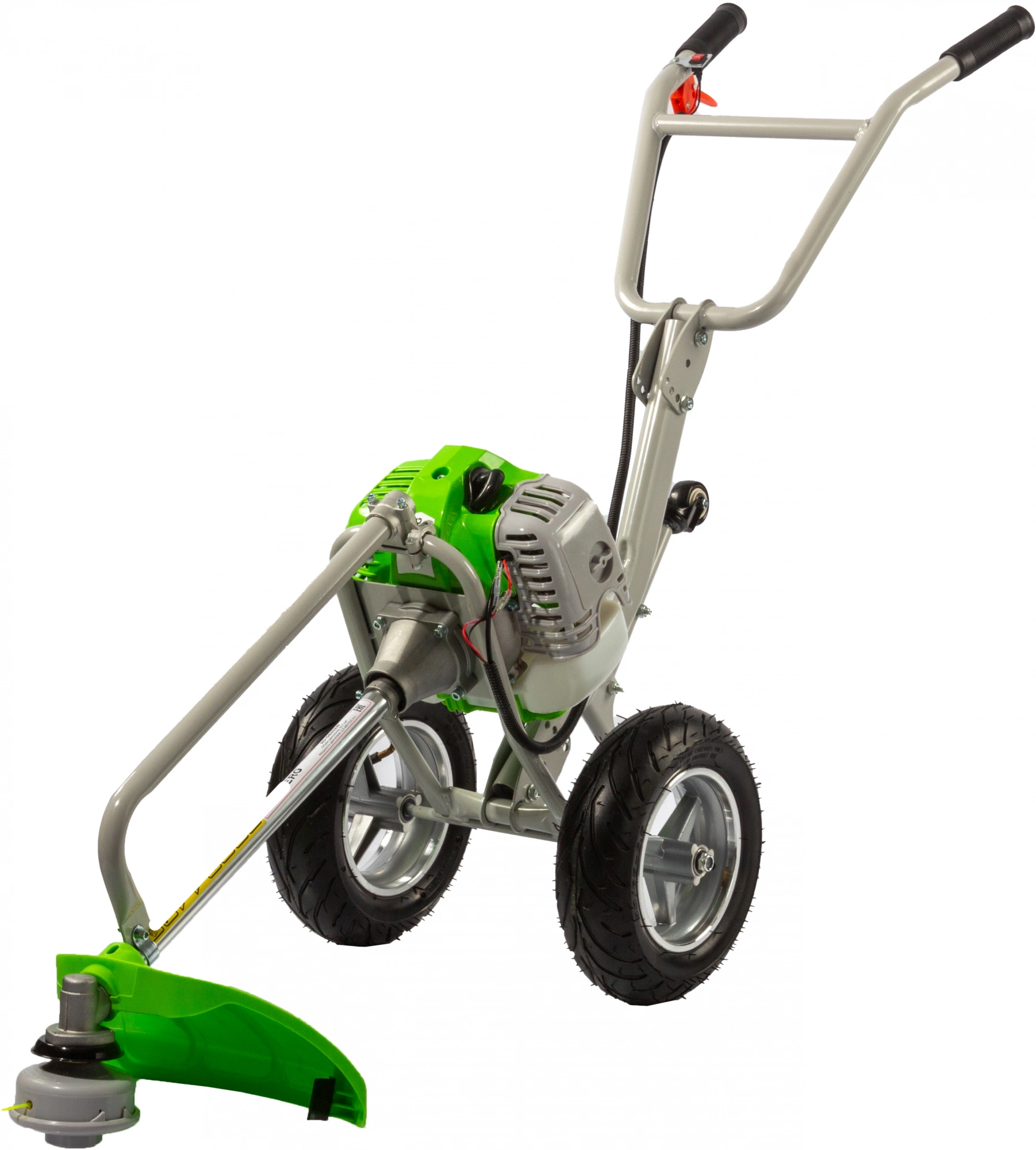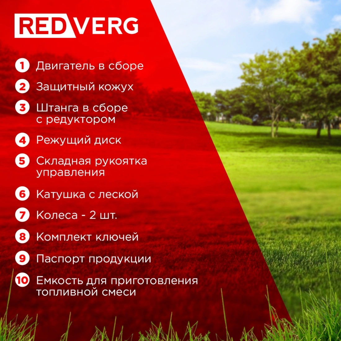 Двигатель в сборе, Штанга в сборе с редуктором, Защитный кожух, Режущий диск, Катушка с леской, Складная рукоятка управления, Колеса - 2 шт., Комплект ключей, Паспорт продукции, Емкость для приготовления топливной смеси