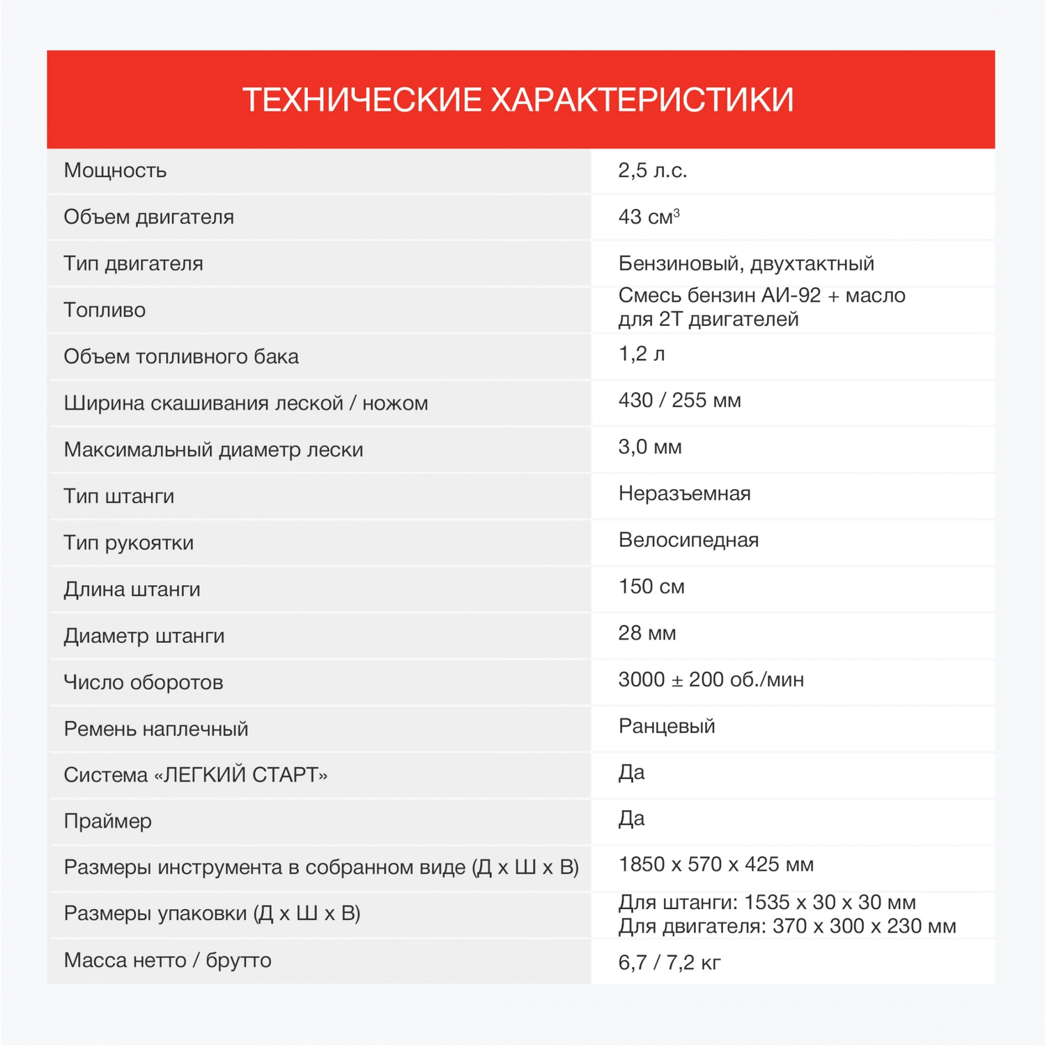 Блок двигателя, Штанга, Комплект крепежа, Комплект рукояток, Ранцевый ремень, Защитный кожух, Бутылка, Нож, Шпуля с леской