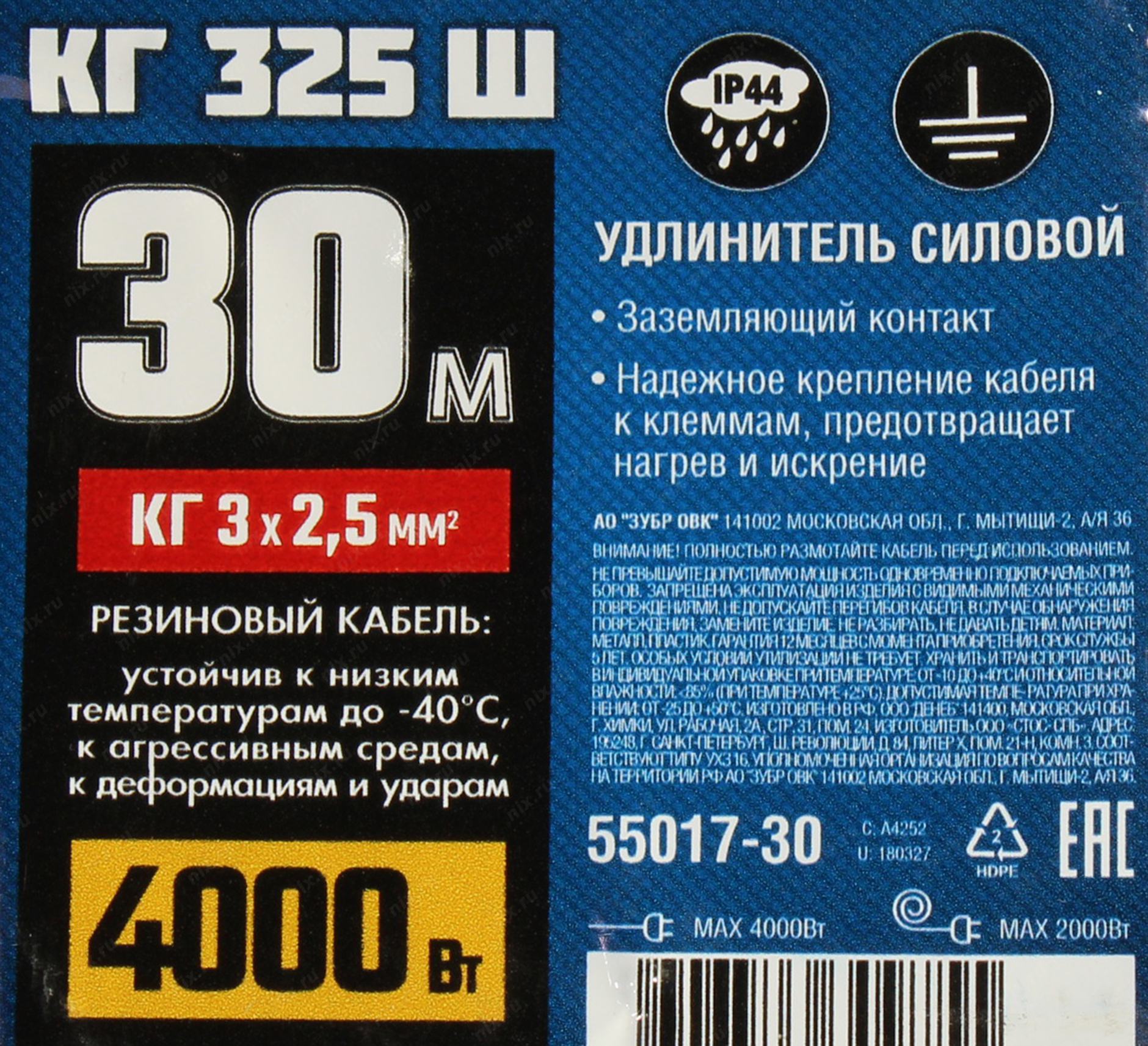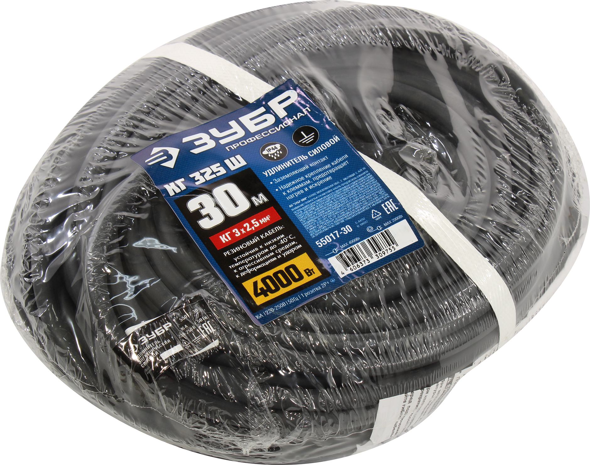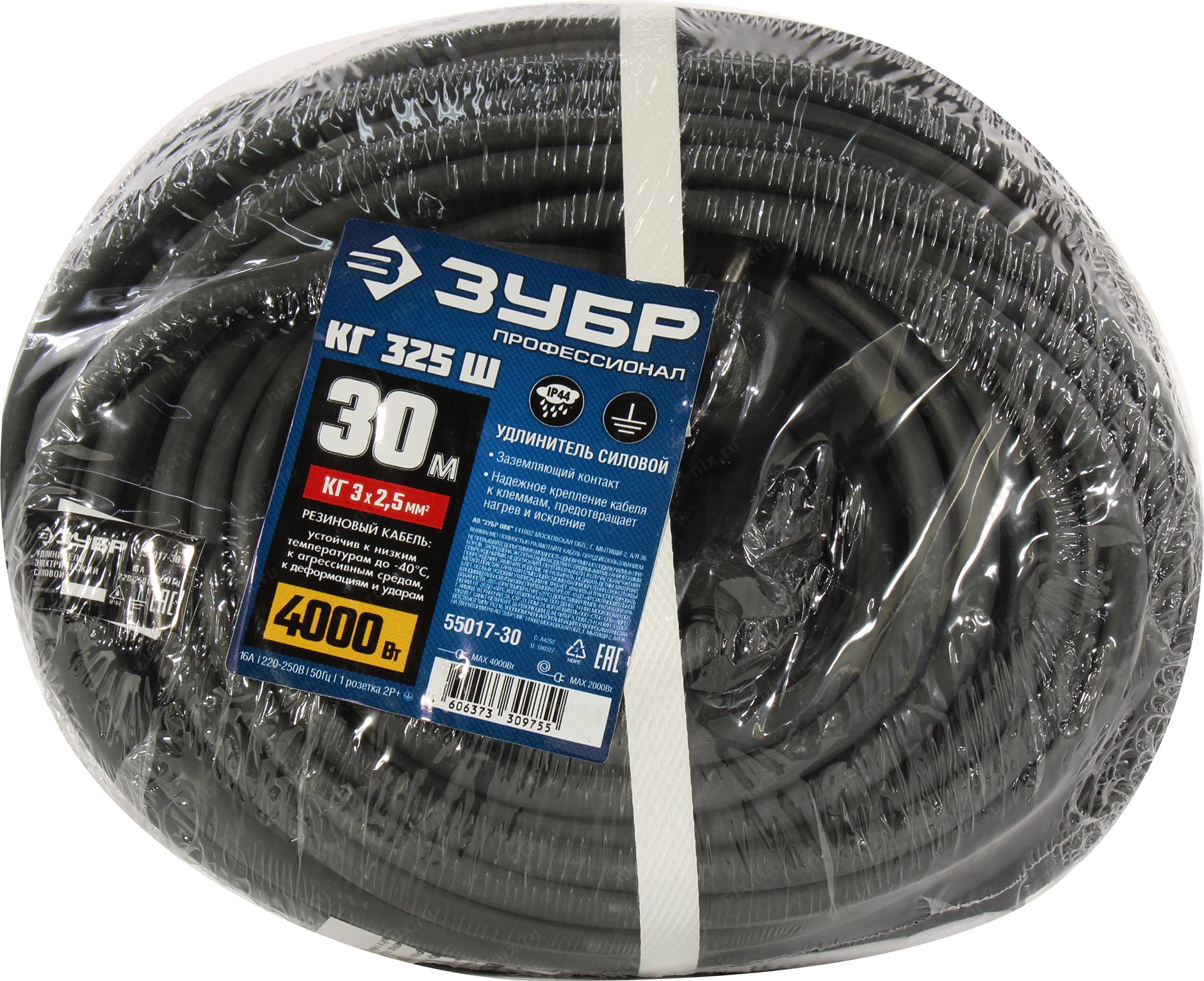 Удлинитель силовой Зубр 55017-30 3x2.5кв.мм 1розет. 30м КГ 16A без катушки черный | НИКС Екатеринбург