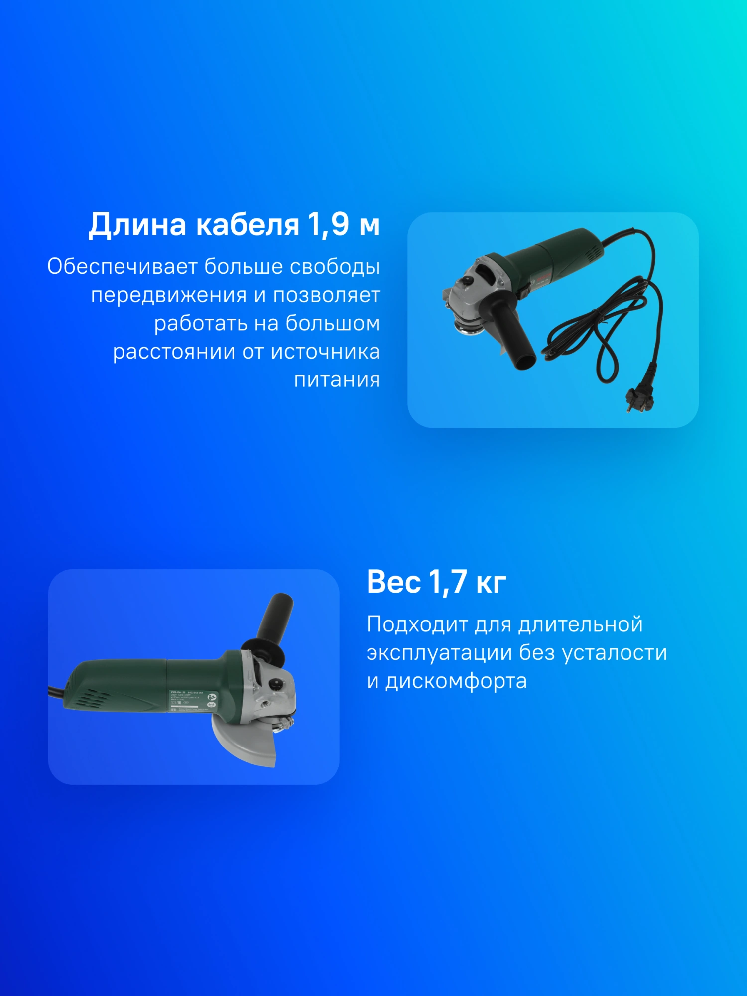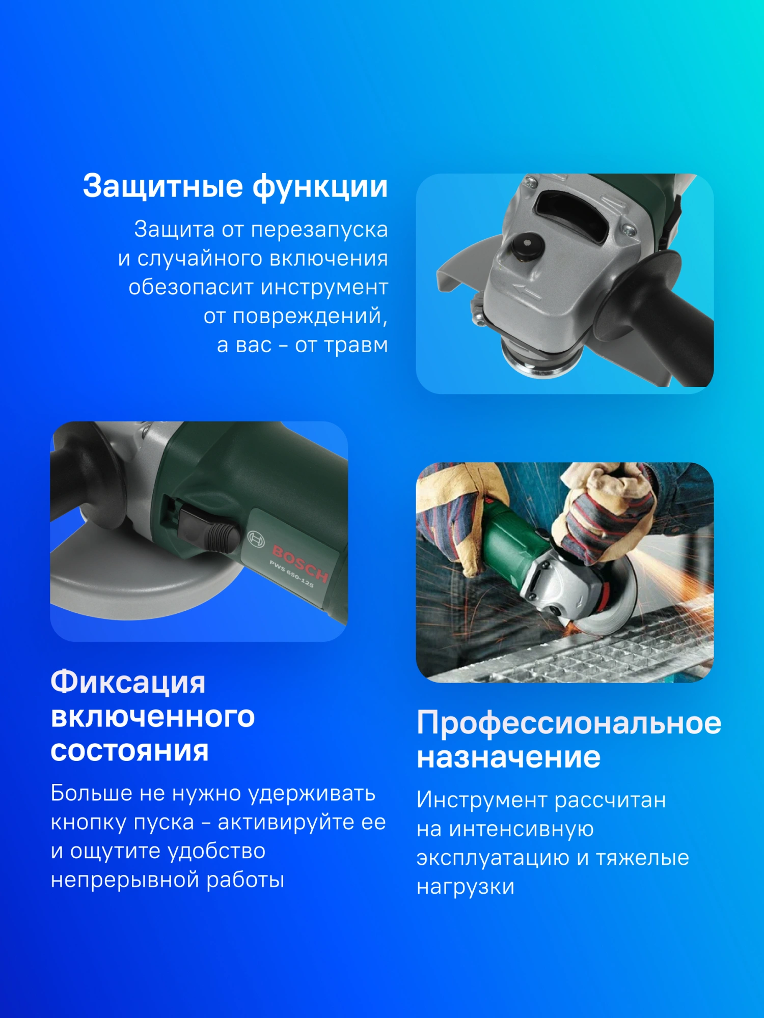Угловая шлифмашина (болгарка). Компактная модель, проста в управлении благодаря регулировке защитного кожуха без инструмента и наличию у кожуха специальной кодировки, предотвращающей его неправильную установку. Повышение комфорта благодаря возможности установки рукоятки с любой стороны, простая замена диска без инструмента благодаря блокировке шпинделя. Оптимальная производительность и увеличенный срок службы благодаря запатентованной системе Dust Protection от Bosch. Предотвращает забивание шарикоподшипника пылью, образующейся в ходе шлифования и резки.