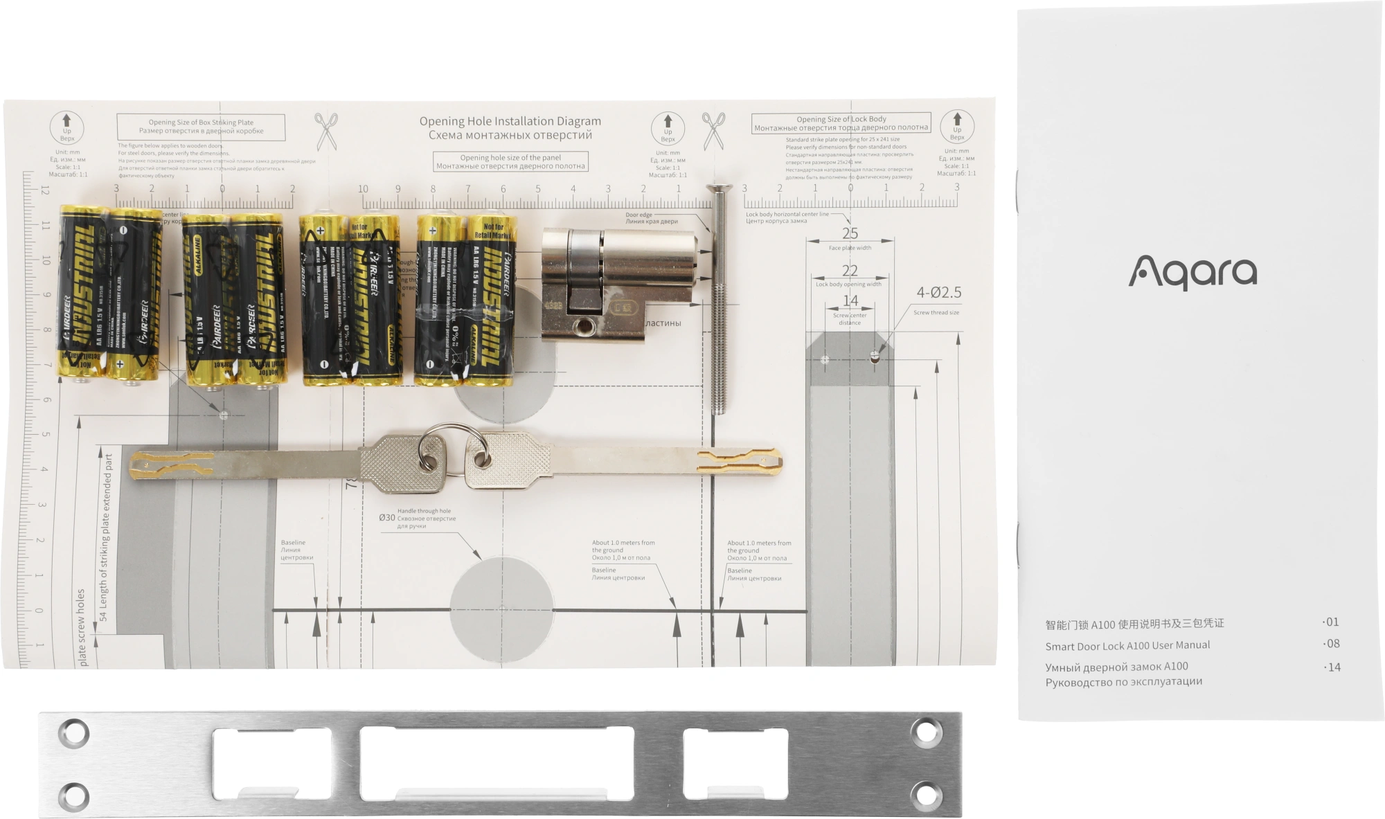 Лицевая панель x 1, Внутренняя панель x 1, Корпус замка x 1, Цилиндровый механизм x 1, Аварийный ключ x 2, Ответная планка замка x 1, Комплект аксессуаров x 1, Шаблон для монтажа x 1, Руководство пользователя x 1.