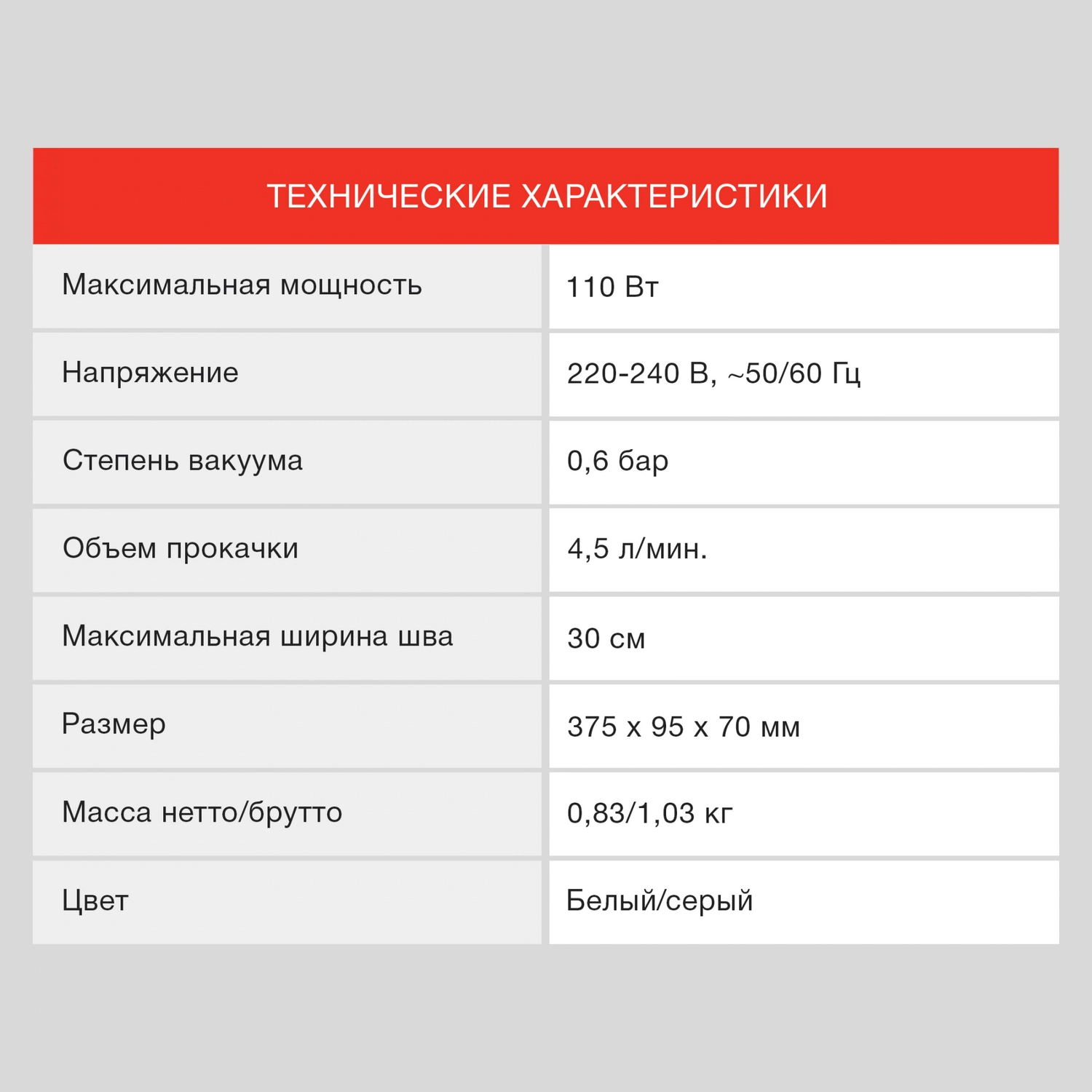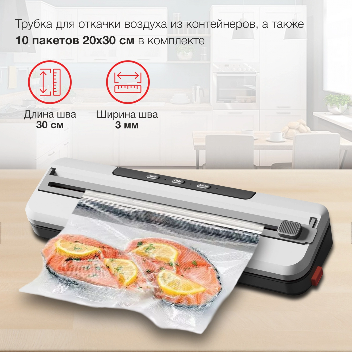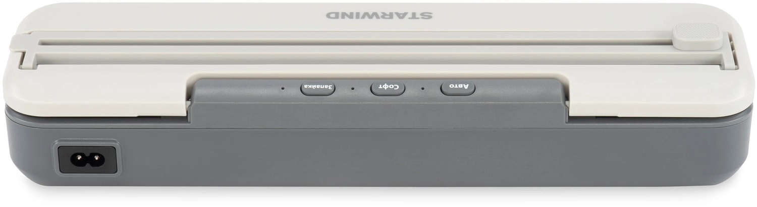 4 программы, откачака 4, 5л/ минуту, макс. давление -65Kpa, шум 70dB, встроенный нож, насадка для вакуумации контейнеров, 10 пакетов 20*30см в комплекте.
