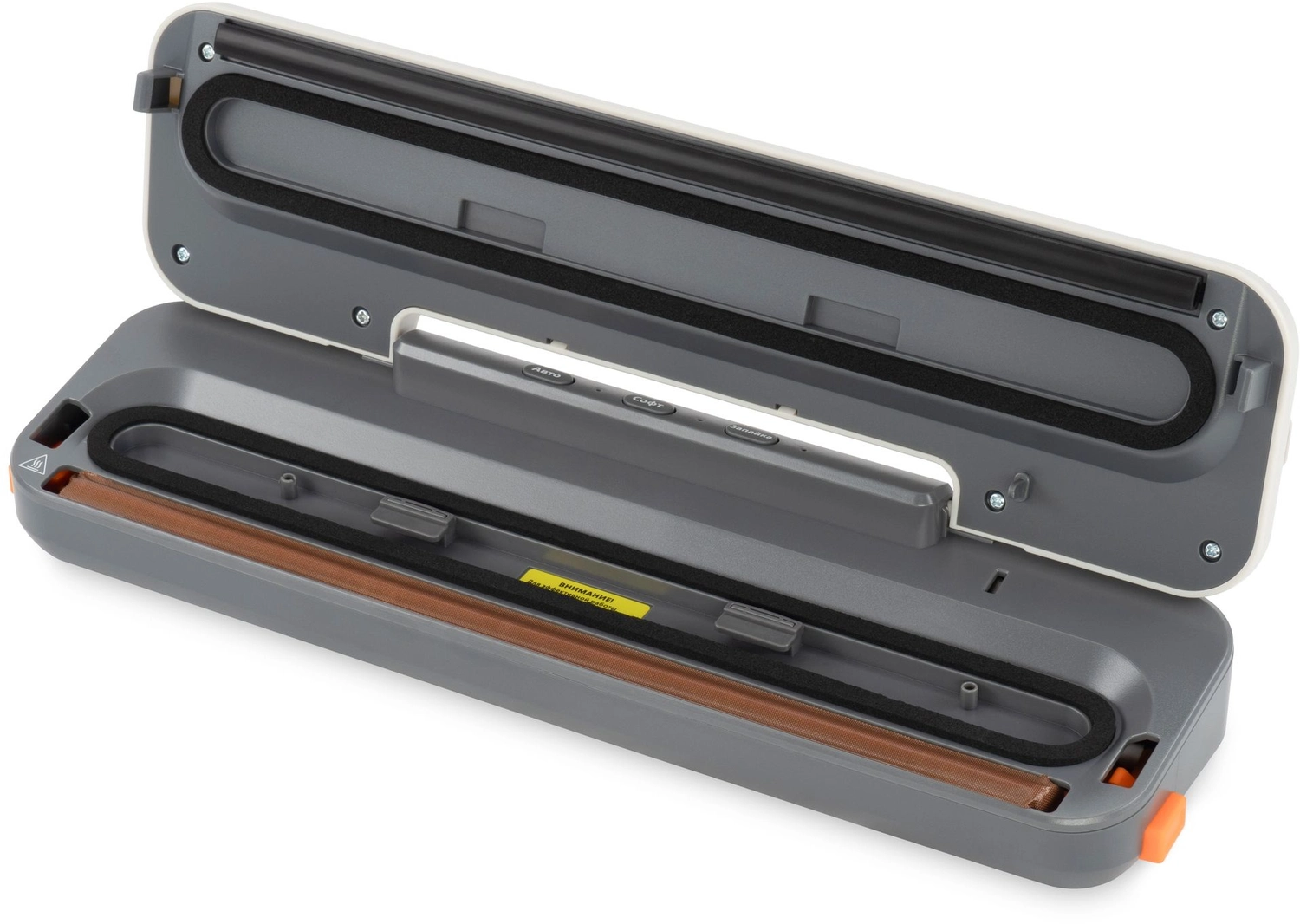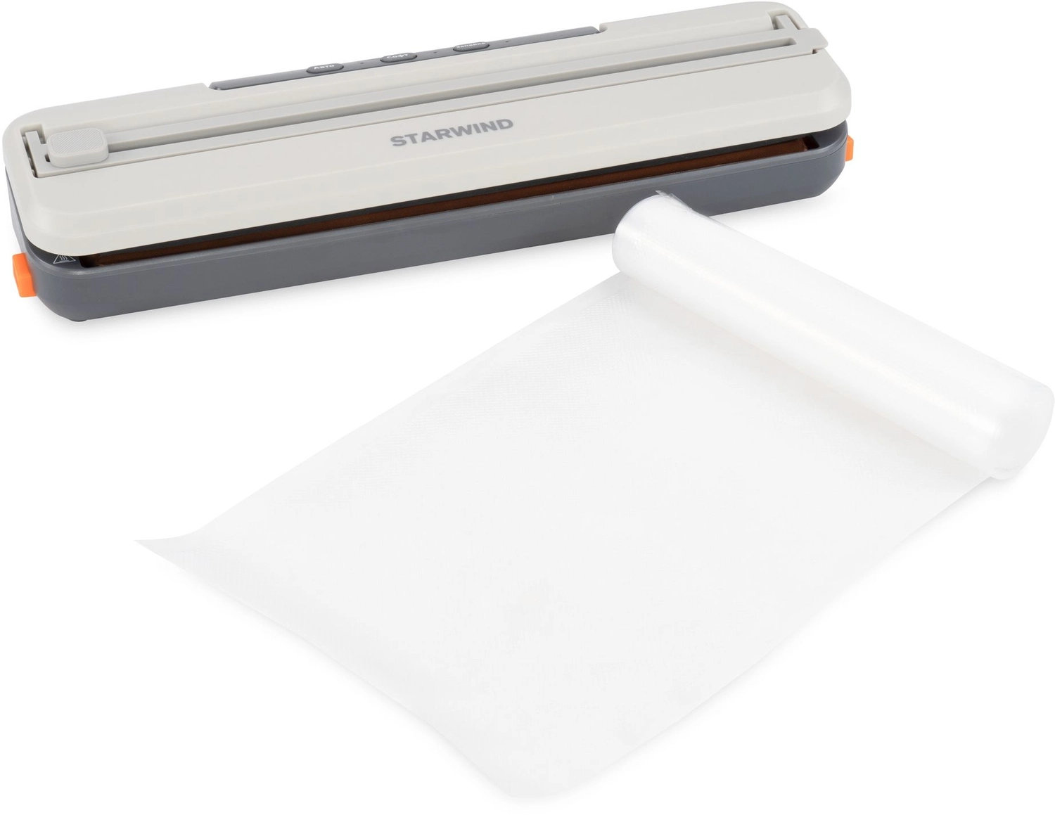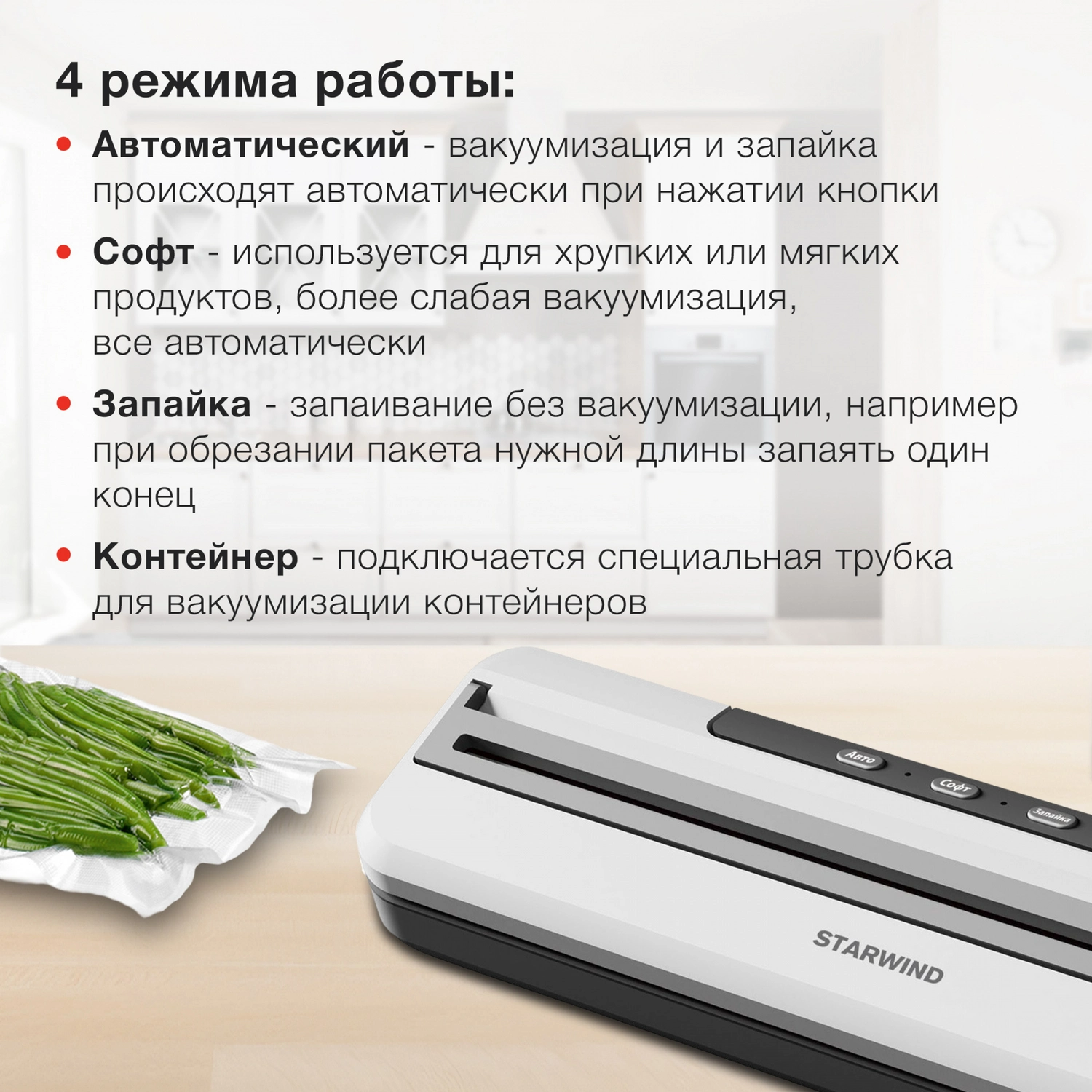4 программы, откачака 4, 5л/ минуту, макс. давление -65Kpa, шум 70dB, встроенный нож, насадка для вакуумации контейнеров, 10 пакетов 20*30см в комплекте.