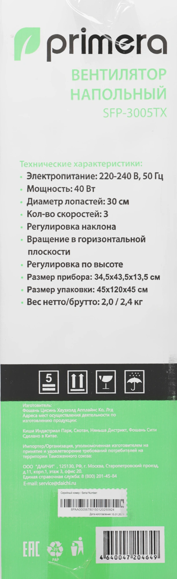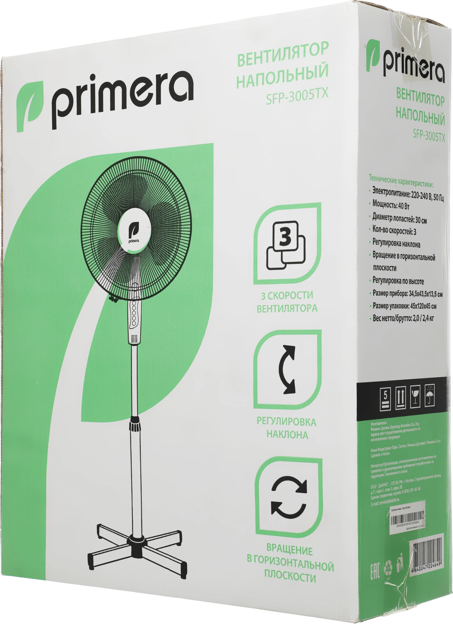 Вентилятор напольный Primera SFP-3005TX 35Вт скоростей:3 белый/ серый
