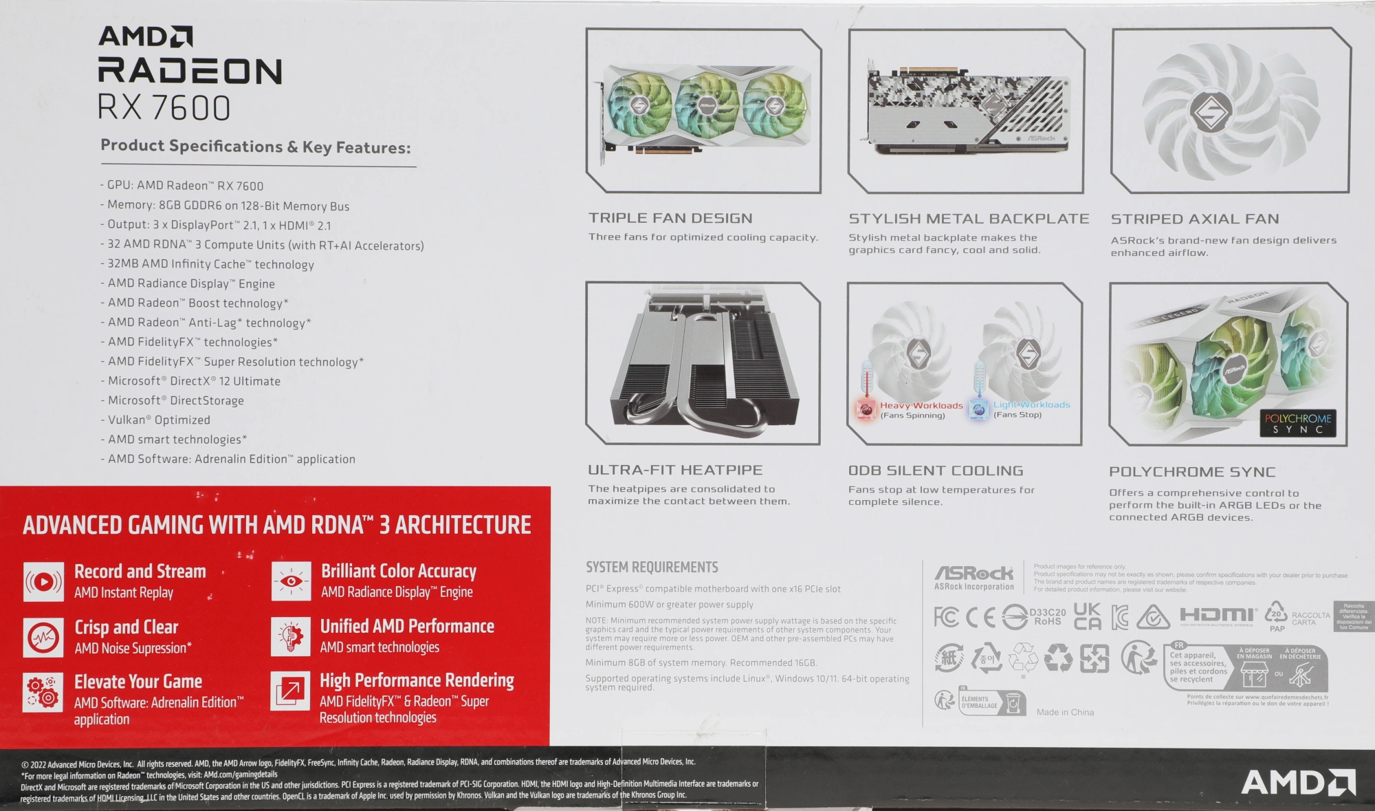 Видеокарта ASRock RX7600 STEEL LEGEND OC 8GB GDDR6 128bit 3xDP HDMI 3FAN RTL (Radeon RX 7600) RX7600 SL 8GO