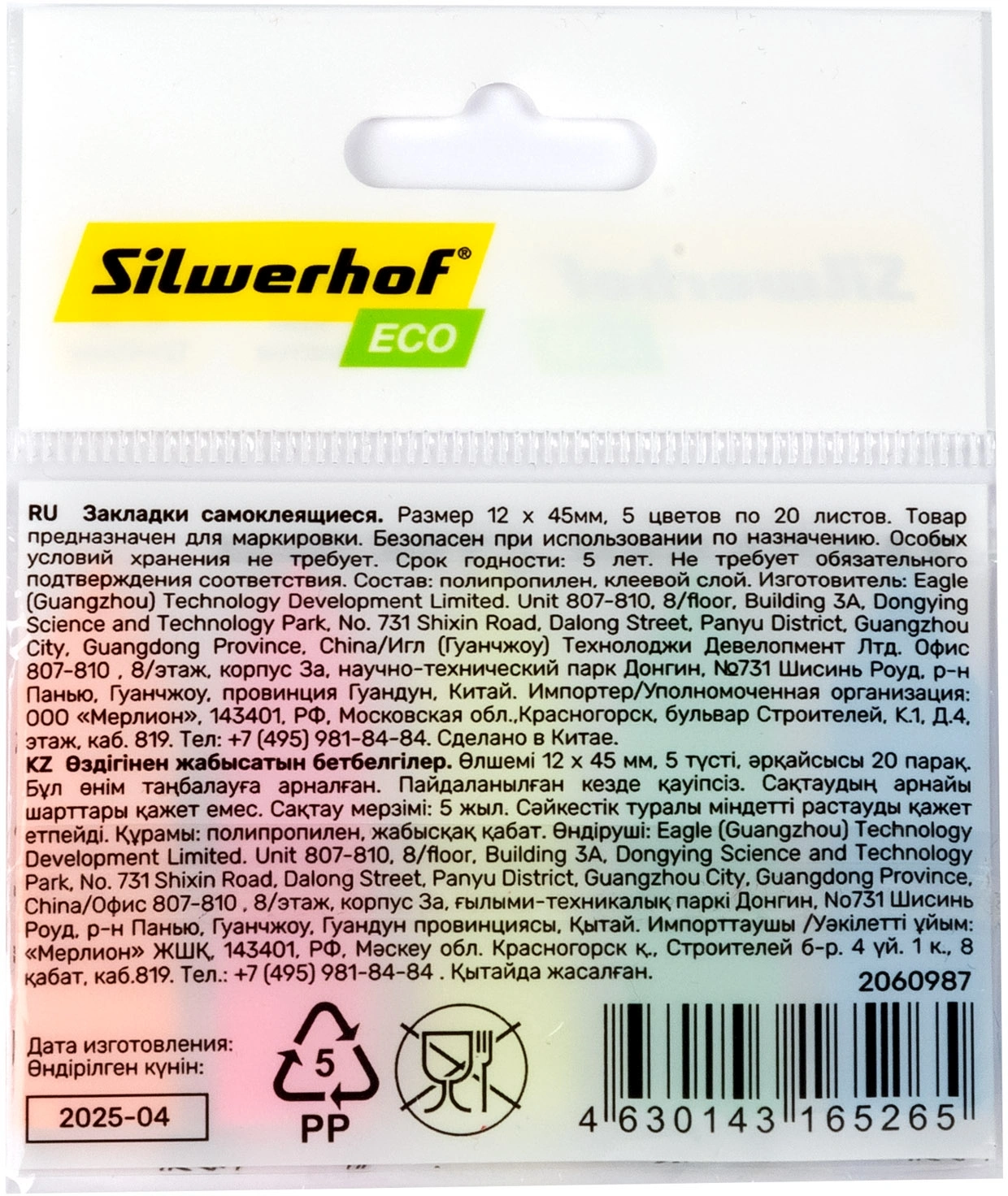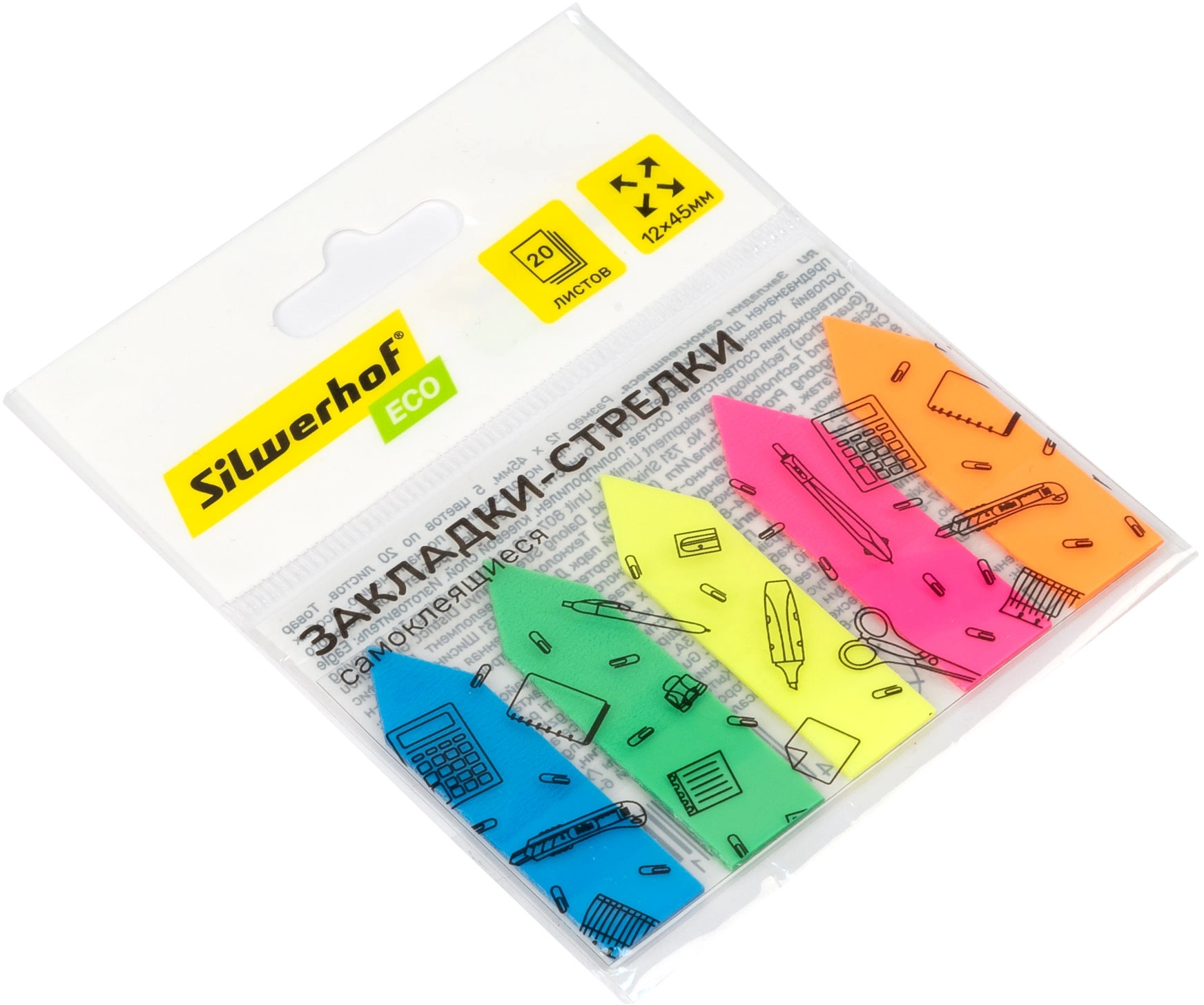 Закладки самокл. пластиковые Silwerhof 45x12мм Eco 5цв.в упак. 20лист стрелки европодвес (продается кратно 24 шт.)